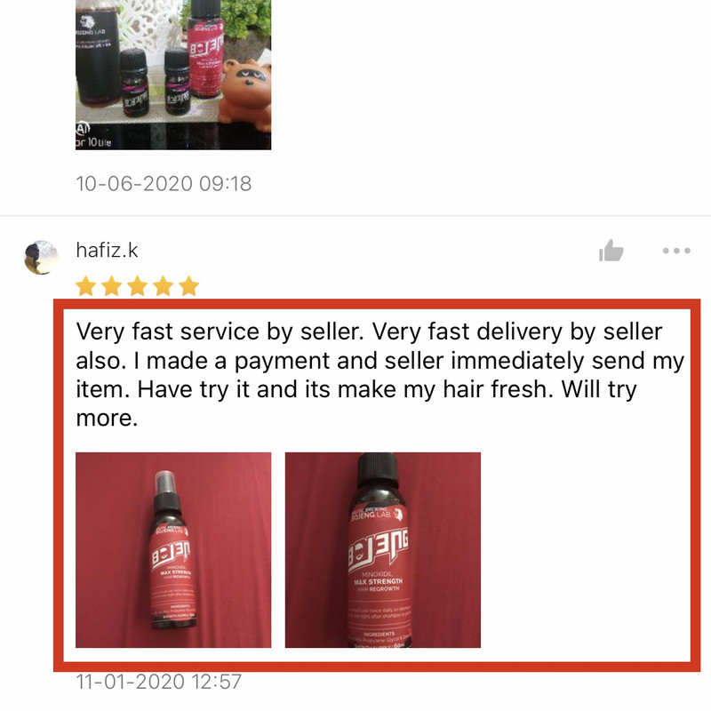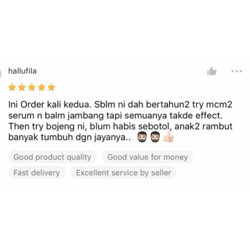 - Sangat berkesan kepada yang mempunyai masalah pertumbuhan bulu dan rambut yang perlahan